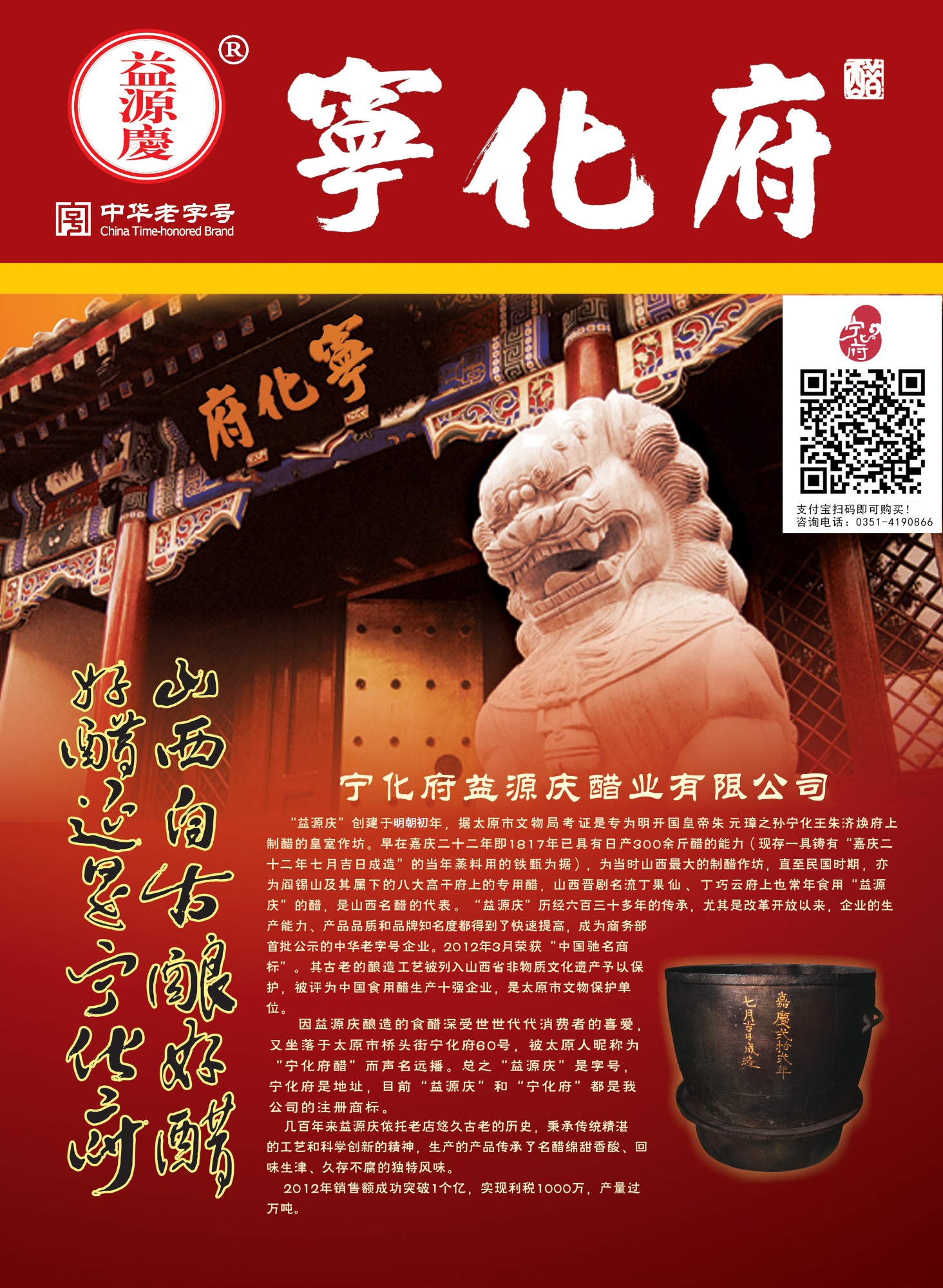 “益源慶”創建于1377年,原系朱元璋之孫寧化王朱濟煥府上制醋的皇室作坊。因益源慶坐落于太原市橋頭街寧化府巷60號,被太原人昵稱為“寧化府醋”。歷經六百三十多年的傳承,企業的生產能力、產品品質和品牌知名度都得到了快速提高,成為商務部首批公示的中華老字號企業。其古老的釀造工藝被列入山西省非物質文化遺產。2012年3月榮獲“中國馳名商標”。
