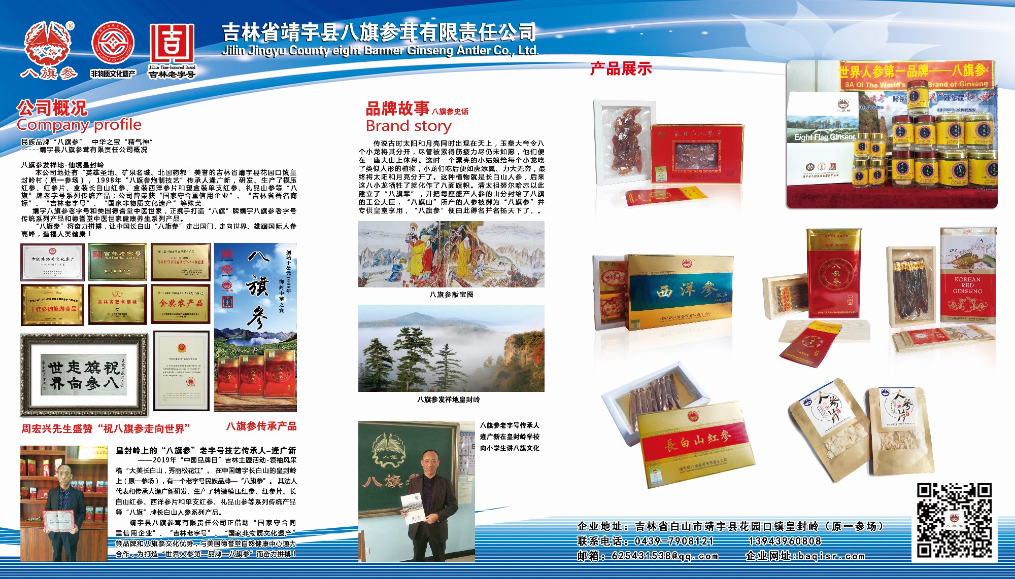 本公司地處有“英雄圣地、礦泉名城、北國藥都”美譽的吉林省靖宇縣花園口鎮皇封嶺村(原一參場),1998年“八旗參炮制技藝”傳承人逄廣新傳承并光大了其家族逄家老字號,研發并生產了“八旗”牌精品鐵盒模壓紅參、紅參片、盒裝長白山紅參、盒裝西洋參片和塑盒裝單支紅參、禮品山參等老字號傳統產品;八旗精氣神紅參片(原參)、紅參粉、白參粉、山參粉等中醫世家健康養生型科技產品,主要特色是八旗參老字號傳統技藝與美國德譽堂中醫世家古法炮制、專利配方天然大融合;
