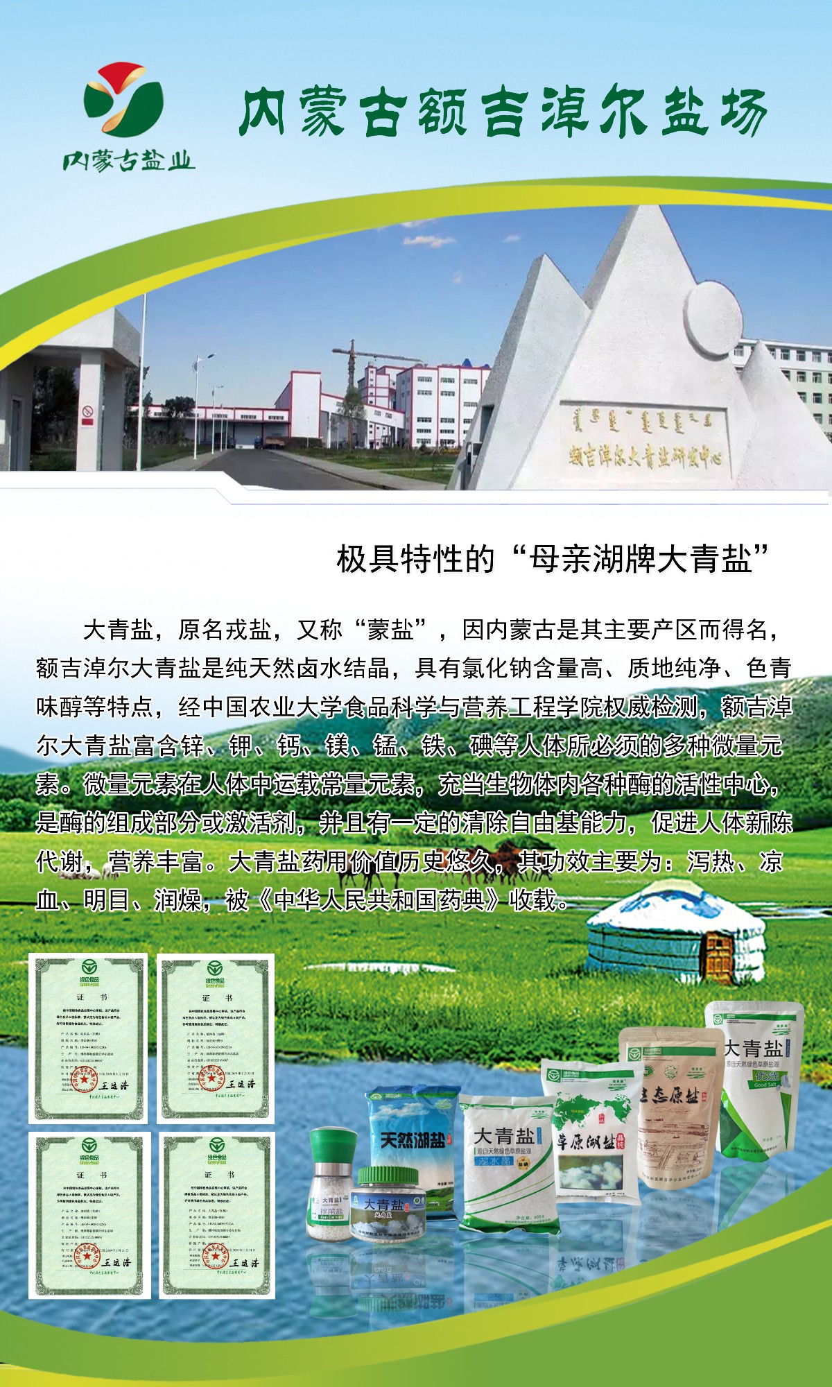 70余年來(lái),內(nèi)蒙古額吉淖爾制鹽有限公司一直精心致力于大青鹽產(chǎn)品的開采與研發(fā),產(chǎn)品有食用鹽、畜牧鹽、工業(yè)鹽三大系列30多個(gè)品種,不斷銷往國(guó)內(nèi)外。