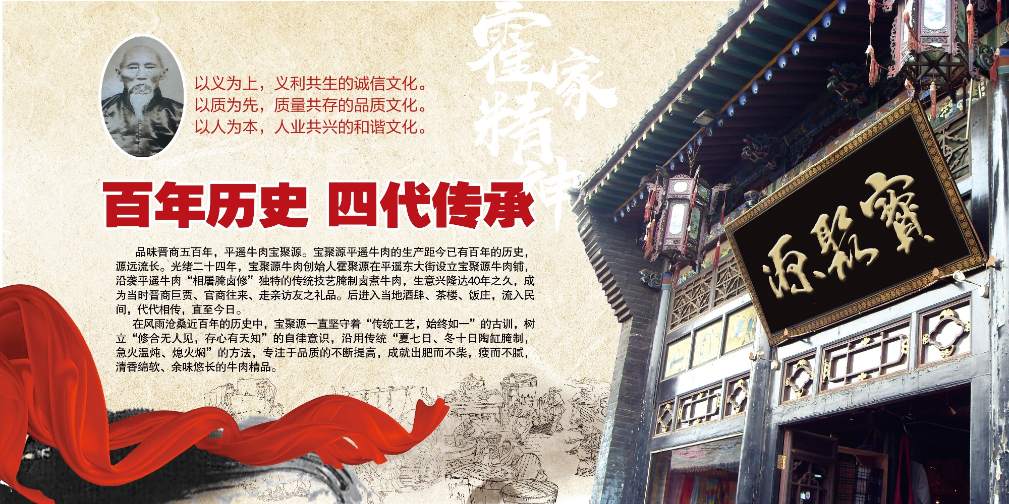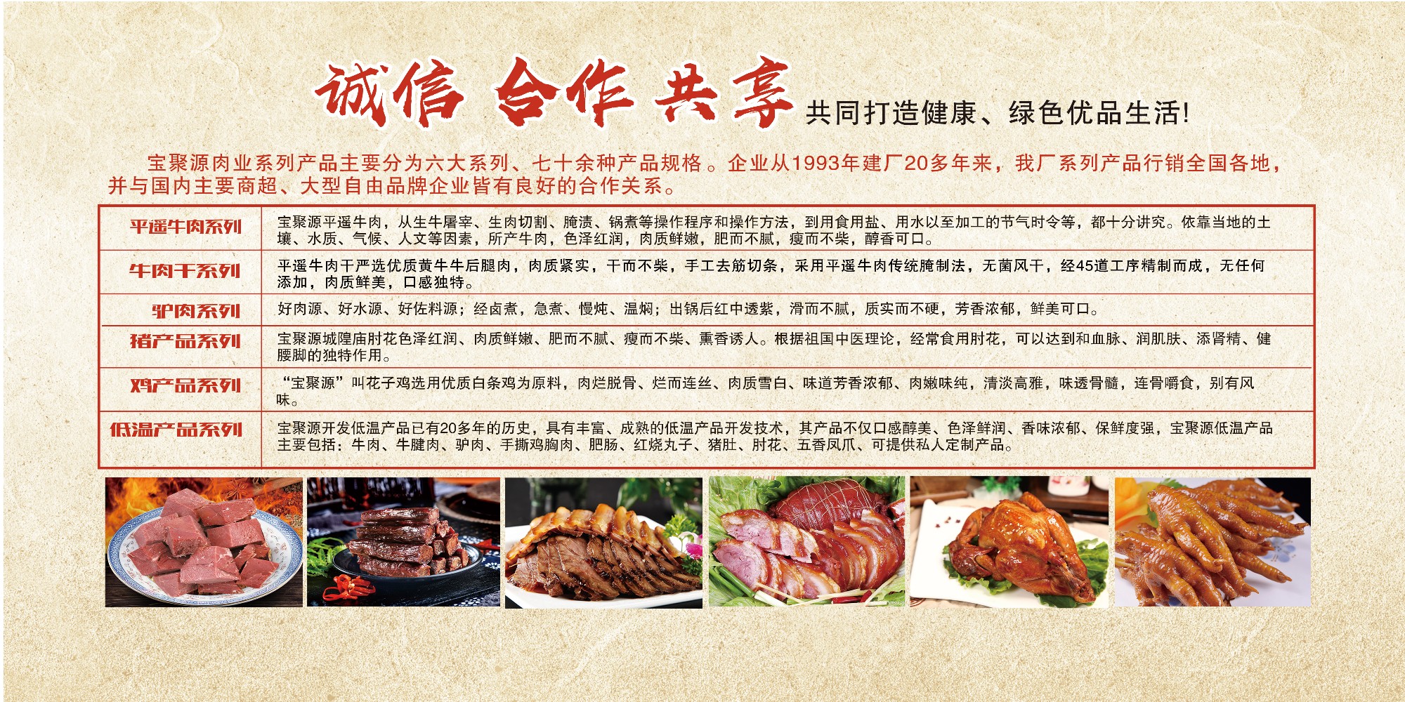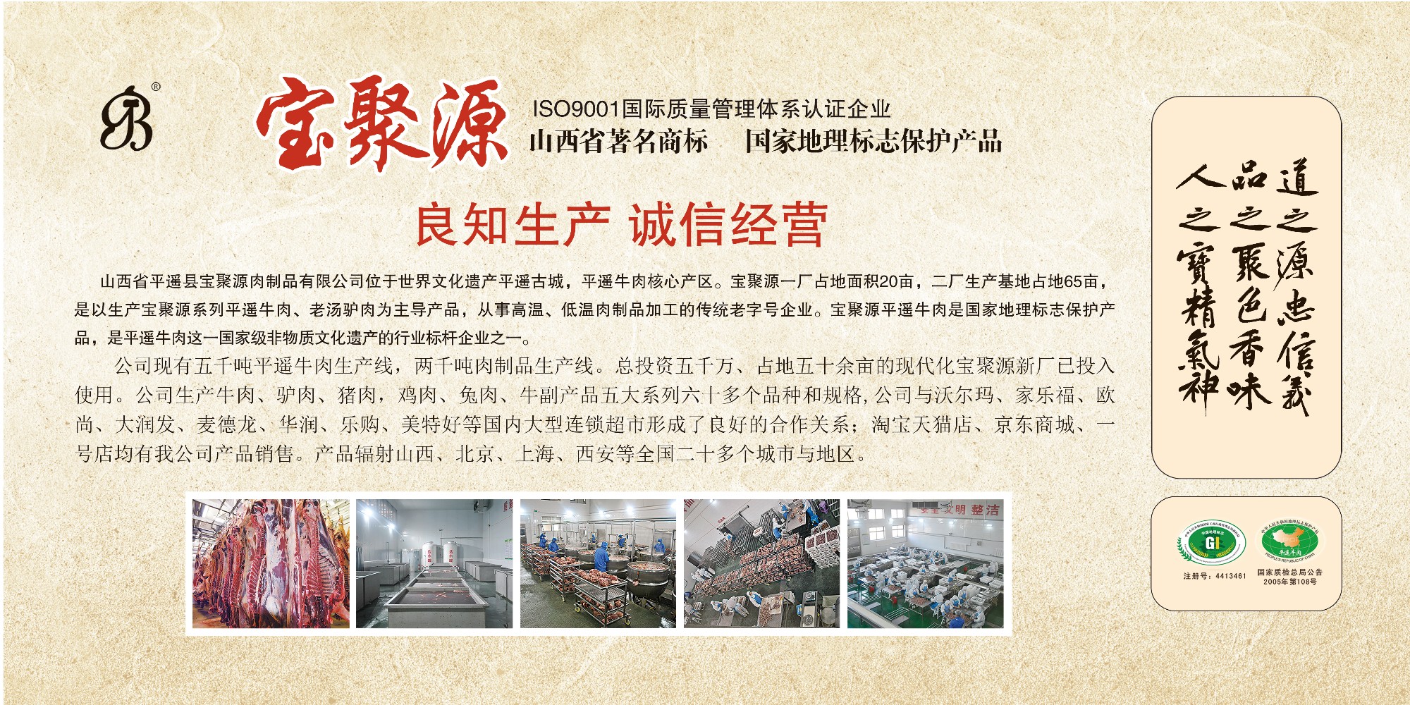 山西省平遙縣寶聚源肉制品股份有限公司位于世界文化遺產(chǎn)平遙古城岳壁鄉(xiāng)金莊村平南路11號,公司秉承濃厚的晉商文化這一寶貴財富,發(fā)揚平遙人敦厚智慧的創(chuàng)業(yè)精神,運用傳統(tǒng)工藝和現(xiàn)代科學技術。主要以生產(chǎn)“寶聚源”牌平遙牛肉、驢肉、豬產(chǎn)品、雞產(chǎn)品等。