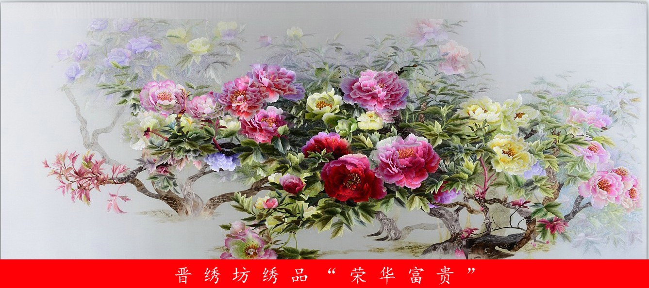 作品主要以人物肖像、風景名勝、花鳥魚蟲、動物猛獸等為主,或栩栩如生、憨態可掬,或古樸典雅、玲瓏可愛,或粗獷豪放、憨實逼真,極具地方特色。尤以巨幅富貴牡丹、五臺山全景、東臺日出、巖山寺壁畫、清明上河圖、五牛圖、猛虎、狼狗等為本公司代表作,曾作為五臺山腹地傳統民間手工制品而受到了聯合國教科文官員的贊賞;尤其是《晉商圖》在上海世博會山西館的展出,以及在新加坡成功舉辦的“晉繡藝術珍品展銷”活動,更為晉繡坊走進世界繡苑提供了良好的發展機遇。