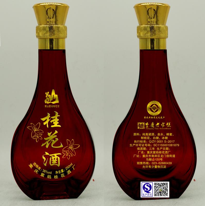 重慶紫焰桂花酒廠成立于1993年,位于長江上游的重慶南山。重慶南山的氣候宜人,山下有名泉,紫焰桂花酒取南山之桂花,涂山之泉水,精心釀制而成。酒廠主要生產、銷售“賈紫焰”牌桂花酒系列產品,重慶最具特色的桂花酒,是重慶老字號產品,被列入重慶市非物質文化遺產名錄。
